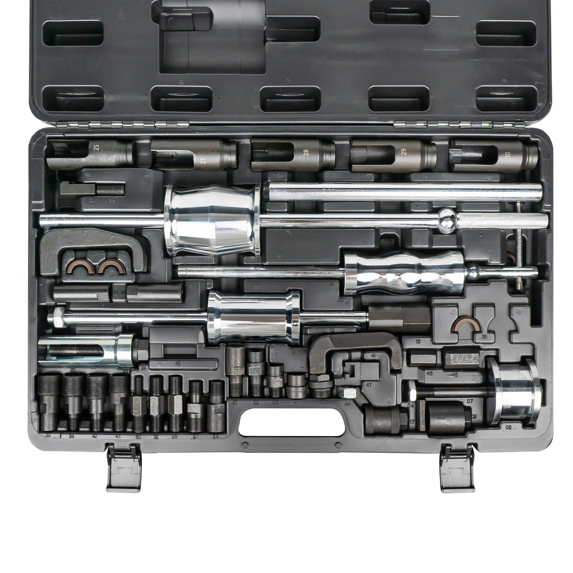 Diseñado para facilitar la extracción de inyectores, este kit permite trabajar de forma segura incluso cuando los inyectores están bloqueados por acumulación de carbonilla o residuos de combustión. Su sistema de extracción garantiza un agarre firme y una intervención precisa, reduciendo el riesgo de daños en la culata o en el propio inyector.