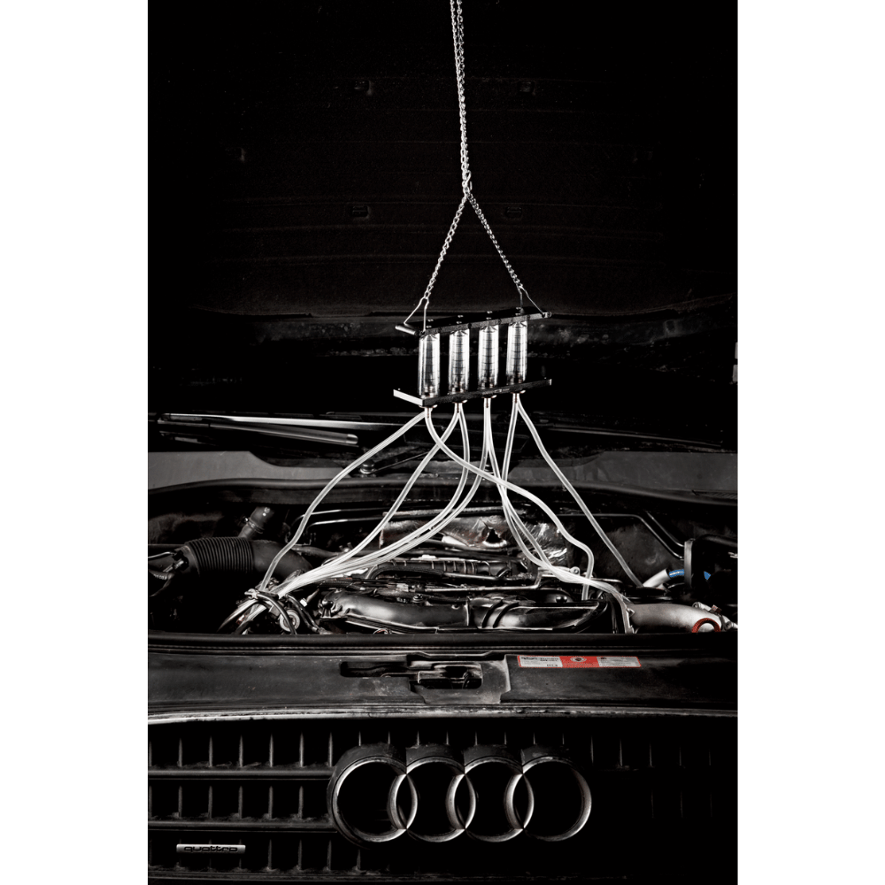 Este equipo permite comprobar de forma rápida si existen fugas o retornos excesivos de combustible en los inyectores, facilitando la detección de inyectores defectuosos. Cuando un inyector presenta un mayor nivel de retorno en comparación con el resto, indica un posible fallo interno, permitiendo actuar con precisión sin necesidad de desmontajes innecesarios.