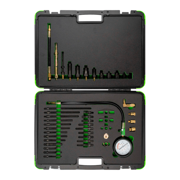 Con un rango de trabajo de 0 a 42 bar, ofrece mediciones fiables en distintos tipos de motores. Su configuración de 44 piezas permite trabajar con múltiples marcas y modelos, facilitando el diagnóstico en automoción multimarca.