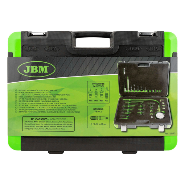 mpresión diésel y gasolina JBM (44 piezas) es una herramienta profesional diseñada para comprobar la presión en la cámara de combustión y evaluar el estado real del motor de forma rápida y precisa.