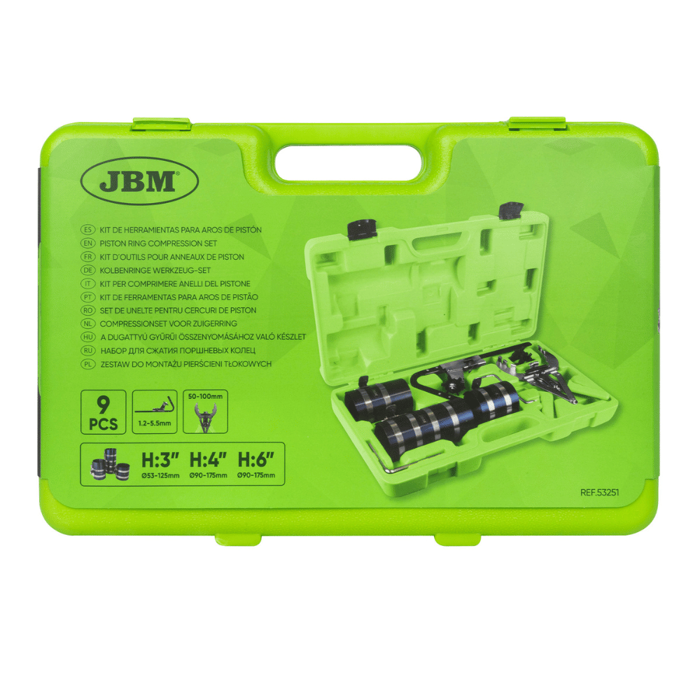 El kit de herramientas para aros de pistón JBM 53251 (9 piezas) es una solución profesional diseñada para la instalación y compresión de segmentos de pistón en trabajos de reparación de motor.