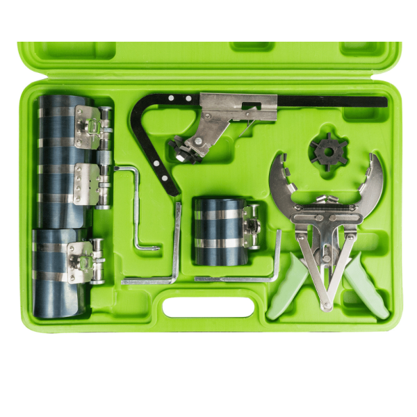 Este комплект incluye ceñidores de distintos tamaños que permiten adaptarse a diferentes diámetros de pistón, facilitando el montaje sin dañar los aros ni el cilindro. Su sistema de apriete mediante carraca dentada garantiza una compresión uniforme y controlada, mejorando la precisión durante la instalación.